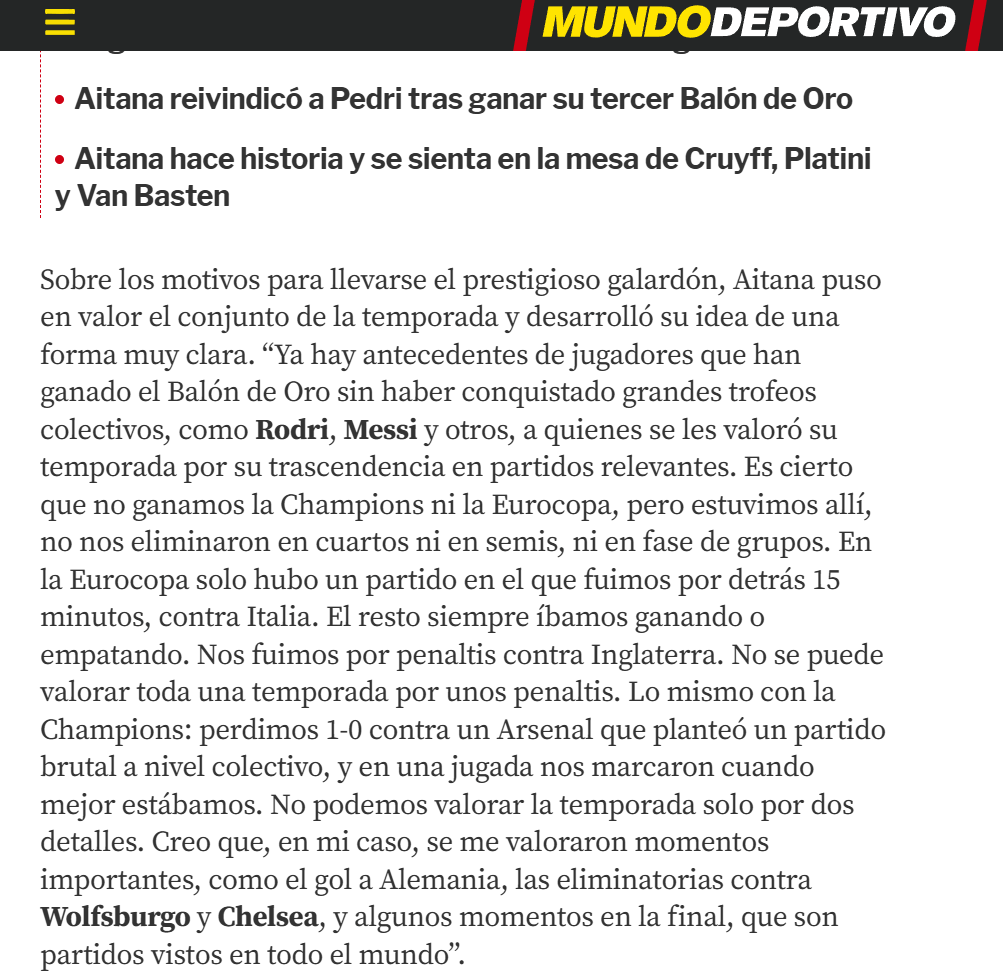 邦马蒂表示:“之前已经有球员赢得金球奖但没有赢得重要的团队奖杯,比如罗德里、梅西等等,他们的赛季表现是根据他们在关键比赛中的表现来评判的。